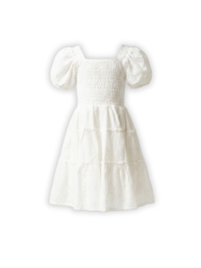 Elegant white cotton dress designed for girls, featuring delicate puff sleeves, a smocked bodice and a soft layered skirt. Made with lightweight and breathable fabric to keep kids comfortable and fresh during warm days, special occasions or everyday wear.