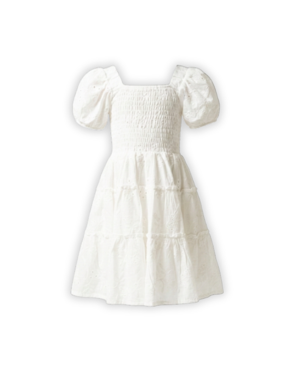 Girls’ White Cotton Dress — Puff Sleeves, Smocked Bodice & Layered Design, Elegant And Comfortable For Kids-SELEN